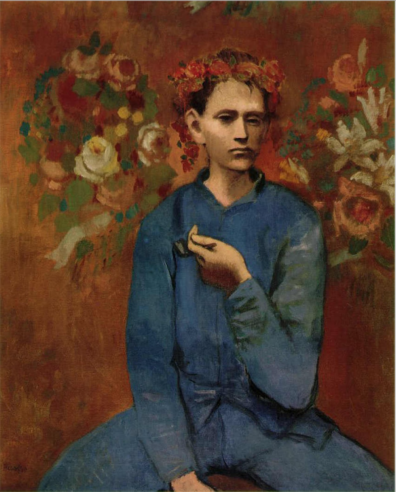 畫中描繪的是一名巴黎工人階級少年,模特兒是一位常出現在「洗衣船」(Bateau-Lavoir)的少年,人稱「小路易」。畢卡索曾形容,當時經常聚集在那裡的,是各種「在地人物、演員、女士、紳士與不良少年」。少年手持煙斗,眼神游離,頭戴玫瑰花冠,背後牆面上裝飾著兩束大型花束,營造出帶有象徵意味的靜謐氛圍。