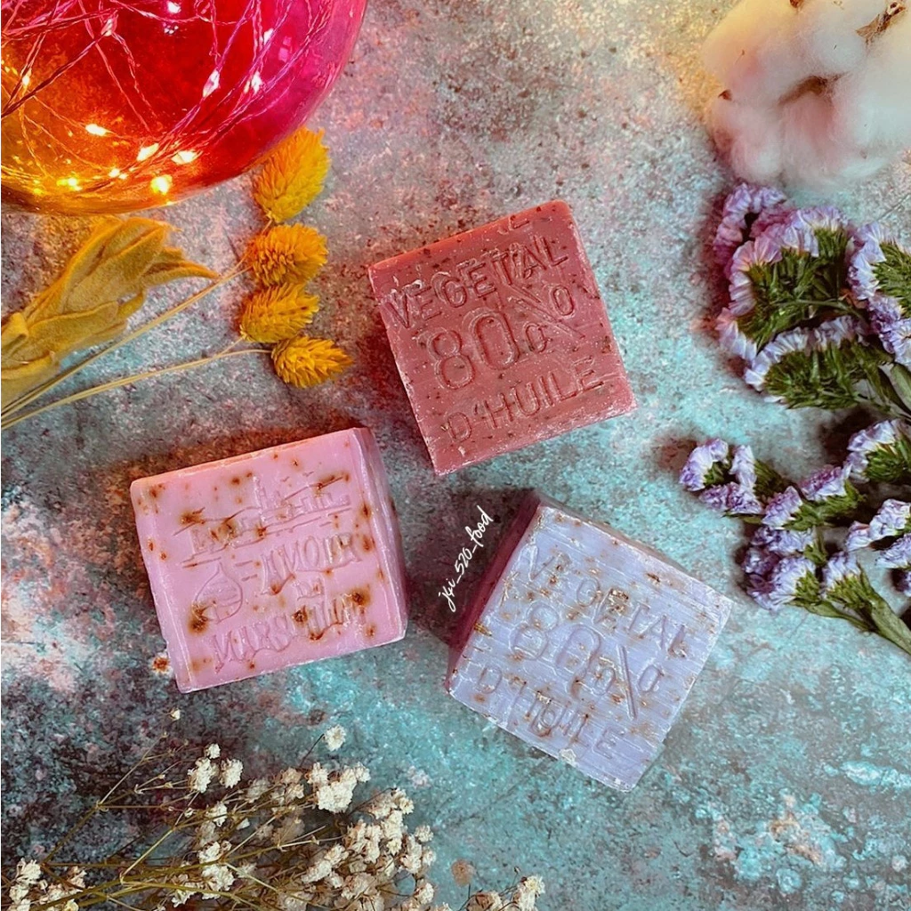 一組漂亮的手工皂禮盒,源自73年歷史的法國正統馬賽皂,天然花瓣與植物顆粒,流傳400年的黃金五步驟,溫和按摩去除肌膚角質