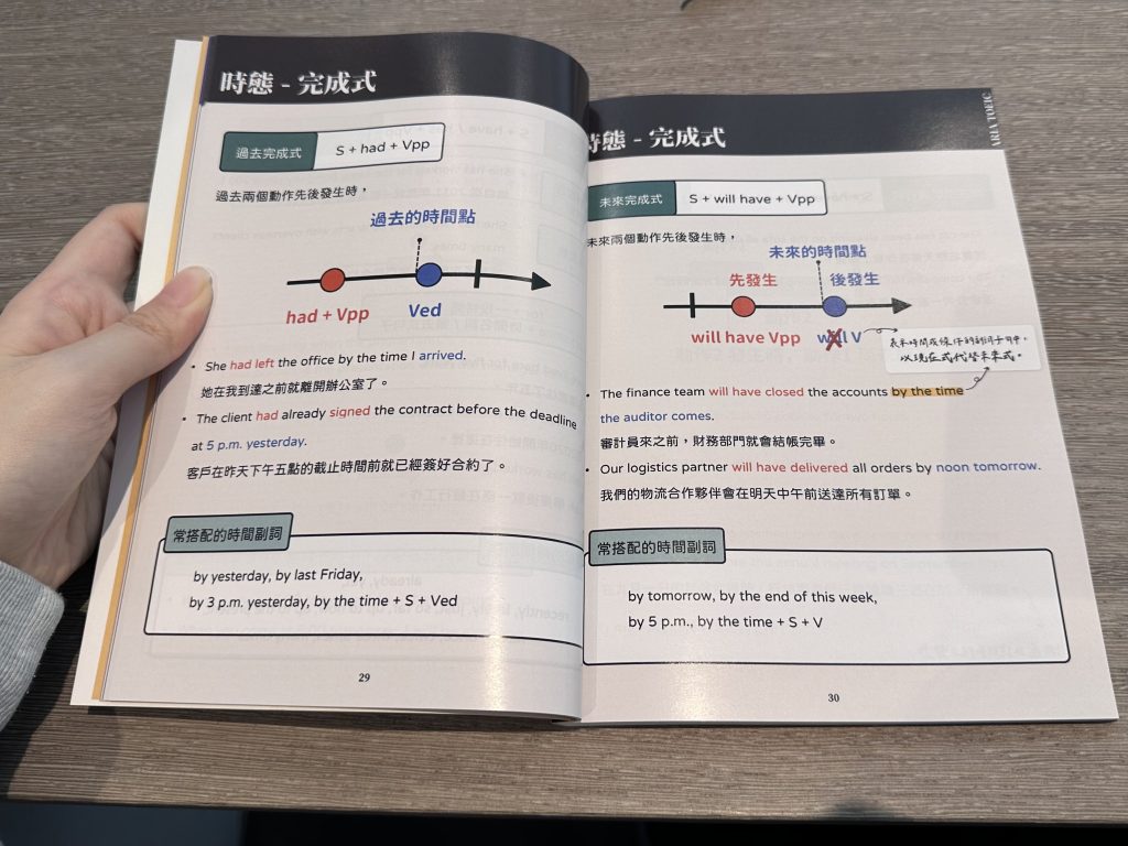 如下圖範例,圖解了時態完成式的概念,一目瞭然,純看書就能很清楚的知道一些比較複雜的英文文法,以及用法、意思、常搭配的副詞,都是多益很關鍵的考點