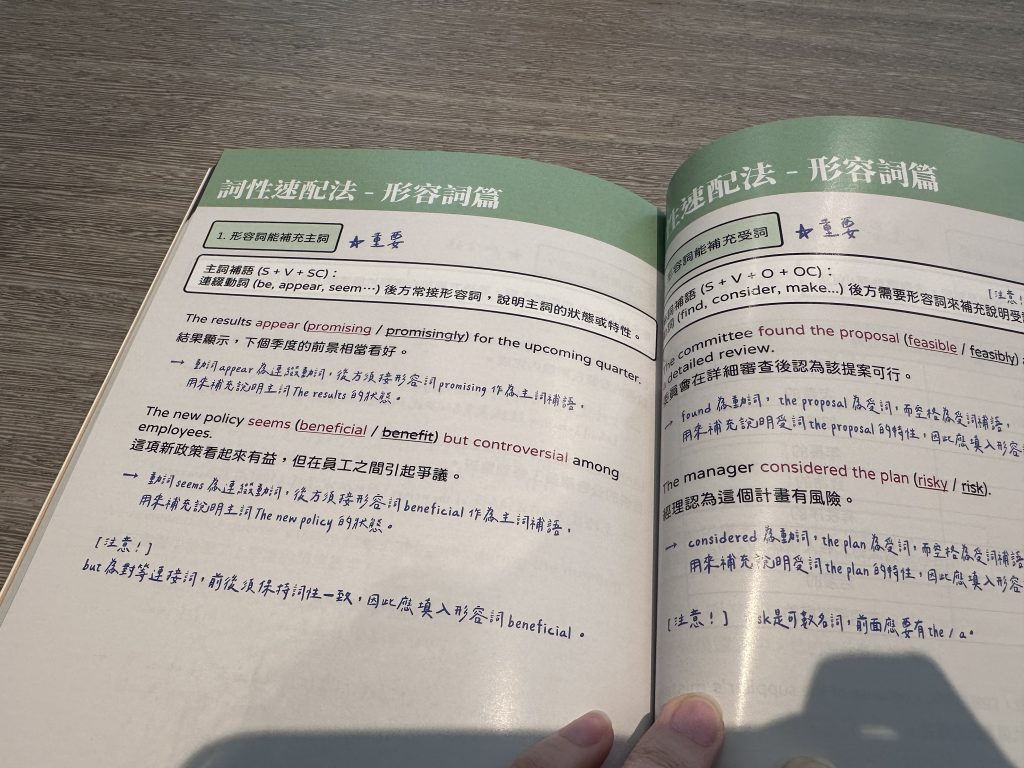 這本書放的比較是一些精華、重要考點的部分,適合想要考前複習重要概念,可以反覆的翻,加強記憶,如果是單字比較弱、想要用看書的方式補強的話,我推薦自己手寫整理自己不熟的單字,考前反覆翻,或是再搭一本單字、閱讀的多益書,不熟的字做記號