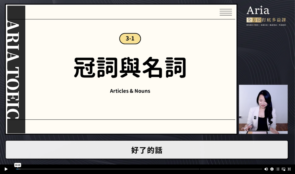 有許多章節的影片都不短,本來有想說會不會太著重文法,而忽略了單字跟閱讀的訓練,不過看下來都有融入課程中,這邊會開箱一下「3-1冠詞與名詞」給大家看一下!
