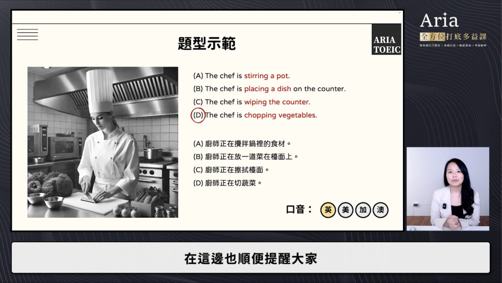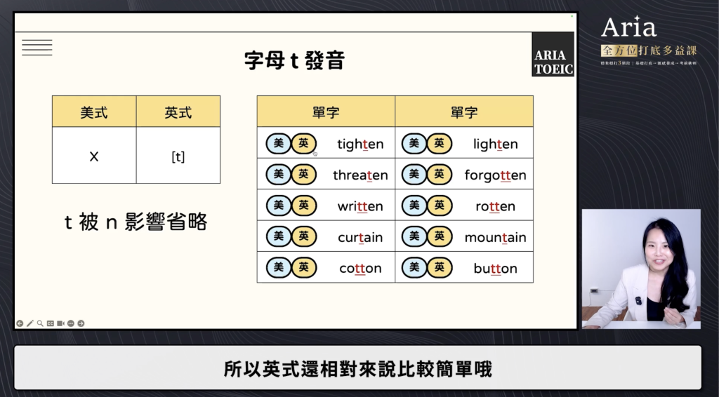 再來是聽力的部分,Aria老師有十年以上的多益教學經驗,所以很能理解學生們會遇到的困難,並針對這些去做加強,聽力部分會先有美式發音vs英式發音、連音與省音、易混淆字、一字多義的章節