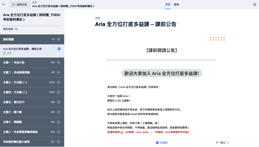 首先進來課程這邊,會看到整個課程的架構,從一開始的課前公告、多益介紹、模擬測驗,然後是文法、補充解題技巧、聽力、閱讀、考前衝刺筆記聽力練習等等,整個課程都是圍繞多益考試所設計,全方位去打底、提升英文能力,幫助大家全方位迎戰。