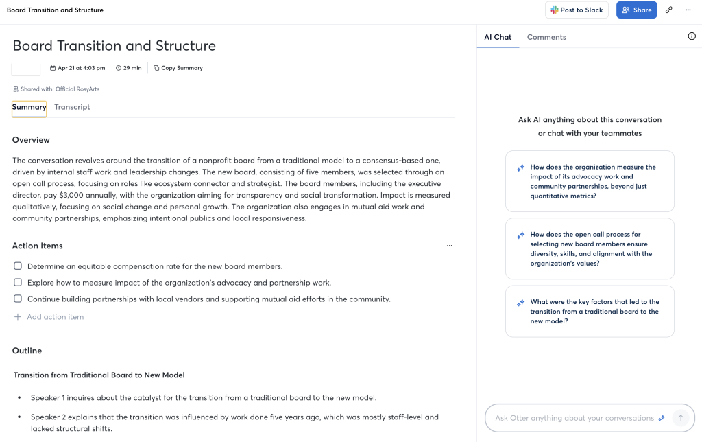 我自己是會把整個逐字稿再丟給 ChatGPT 去整理,比較客製化,但如果你只是想要知道某些特定的小細節,可以直接問 Otter ai chat,他會直接從之前的所有會議中抓給你!!這邊有官方教學:連結