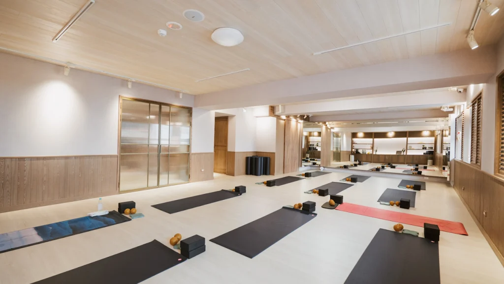 課程選擇非常多元,從高溫濕熱瑜珈、空中瑜珈、基礎瑜珈、瑜珈輪,到器械皮拉提斯與 Barre,週間從早到晚都有課,可以用 app 事先預約。會館常提供無毒有機品牌盥洗用品、淋浴間與休息閱讀區,整體環境乾淨有質感,適合把它當作「下班後固定儀式」。
