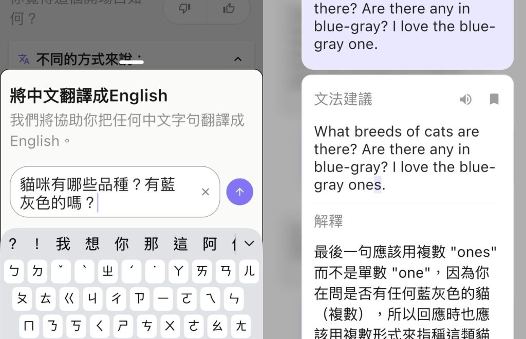 Toko 在對話中的輔助功能是非常強的,很多人應該也跟我一樣,常常知道中文,但不知道英文怎麼說,直接打字他就教你,後面的回饋,解釋也很細,能清楚知道文法哪裡錯了,或是怎麼講更道地!