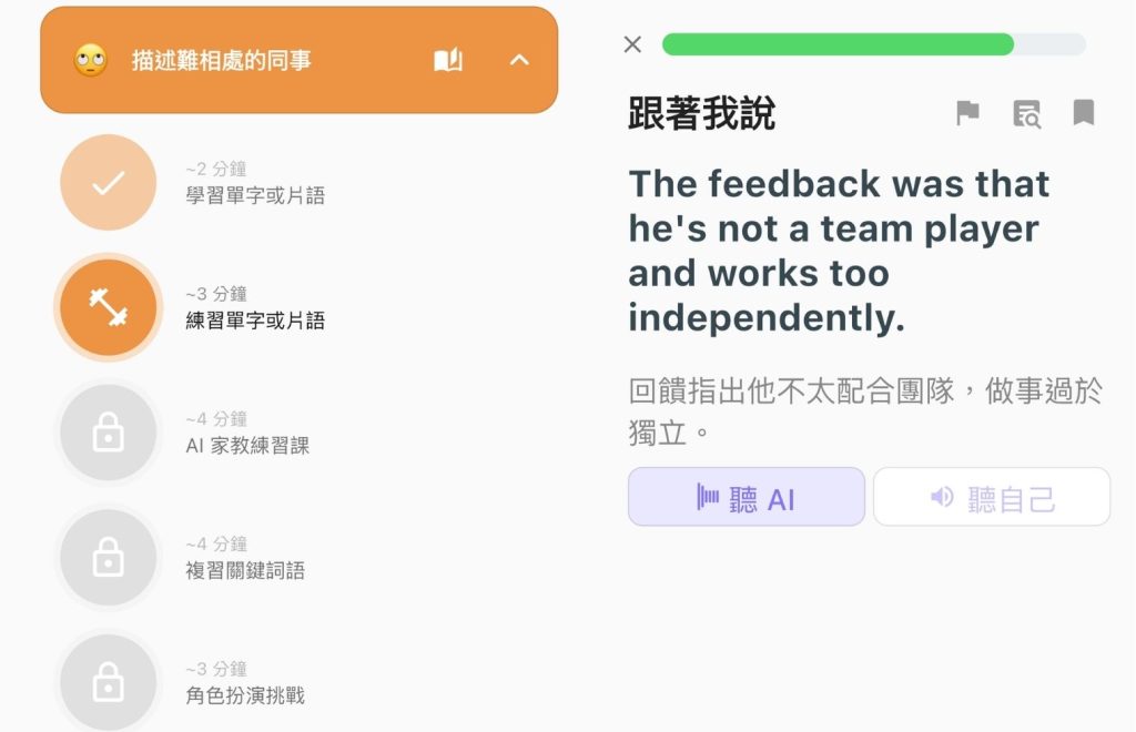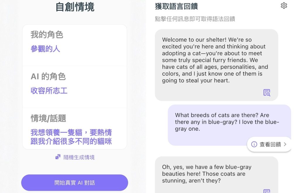 可以自設角色扮演,例如讓 AI 假扮寵物店店員即時對答,也有腳本對話,可以無腦跟唸、熟悉用法,也有新聞英文,安排單字、片語的進度來活用學習,還會安排複習,就是各個點都做得很完善的 AI 老師!