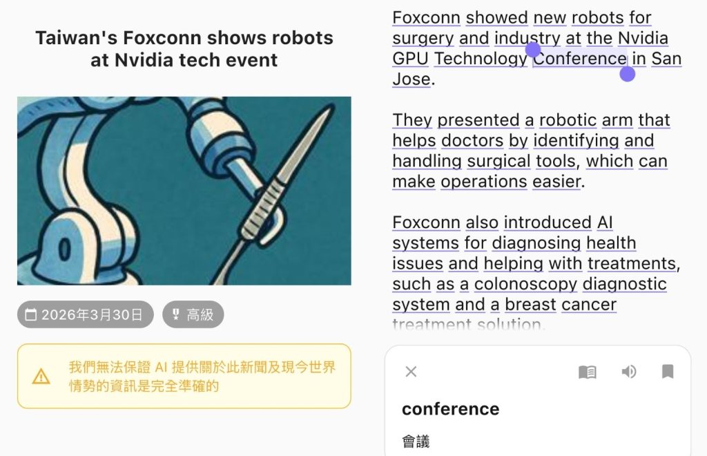 對於中文學習者,Toko 的辨識器特別強化了對「L/R 不分」、「TH 發音偏誤」以及「句尾語調不自然」的偵測能力。當念錯時,不會只是顯示錯誤,而是會標記出特定的音節,並提供一個由高品質語音合成技術產生的標準發音供你模仿,準確度與流暢度目前處於全球頂尖水準。