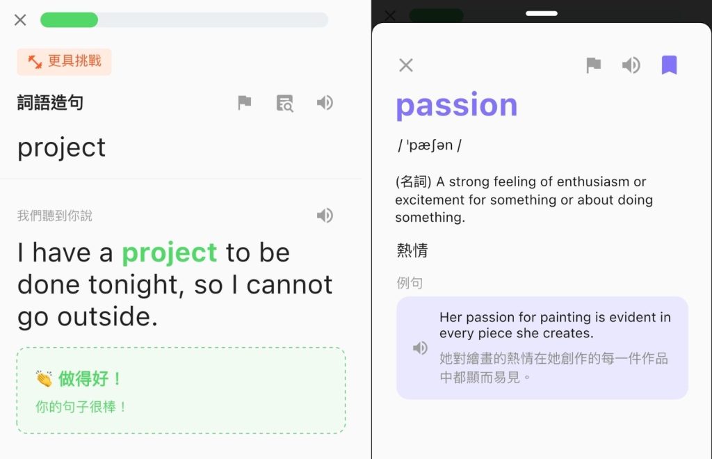 | 缺乏開口機會的學習者(A2~B2) | 適合有一些單字量,但常常講不出來的人,有「即點即查」詞典與「輸入翻譯」功能。 |