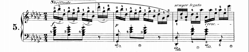 到了第二個主題,不再大量使用半音,而是改以「大二度」(全音)為主,相較之下,旋律聽起來開闊許多,也讓整首練習曲在音響色彩上形成鮮明對比,這首主要重視準確度與心理穩定度,半音音程距離極近,手指只要稍微偏一點,就真的會變成錯音