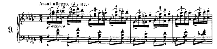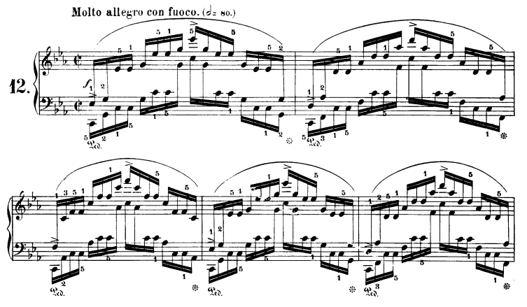 這首練習曲會被叫作「黑鍵」,原因很單純,因為只在鋼琴的黑鍵上演奏。在鋼琴作品裡,這種設定本來就不常見,而且還要維持這麼快的速度,也就成了這首曲子最關鍵、也最折磨人的挑戰。黑鍵位置比較高、間距又不那麼直觀,手型只要一亂,就很容易失控,所以這首常被拿來訓練右手手指的穩定度與控制力。