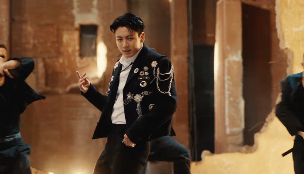 在MV中我們可以看到田柾國身穿MJ式的軍裝夾克,上面裝飾著金屬飾品和流蘇,模仿了已故傳奇人物Michael Jackson的一些標誌性舞蹈動作,如標誌性的抓檔舞步(the iconic crotch grab)。