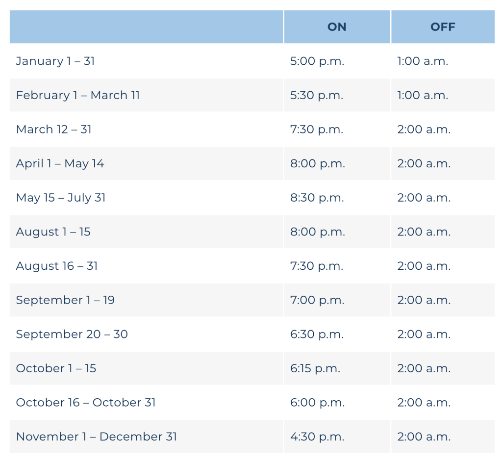 太陽下山後,不用擔心瀑布會看不見!尼加拉瀑布的燈光秀也是重頭戲,每晚都有,會依照季節變動時間,可以看下面的表格是2025的時間表,燈光秀是兩邊共享的,但推薦晚上住加拿大側的酒店再走過來看喔,一樣這邊查時間 >> https://www.niagarafallsusa.com/niagara-falls-state-park/illumination-fireworks/