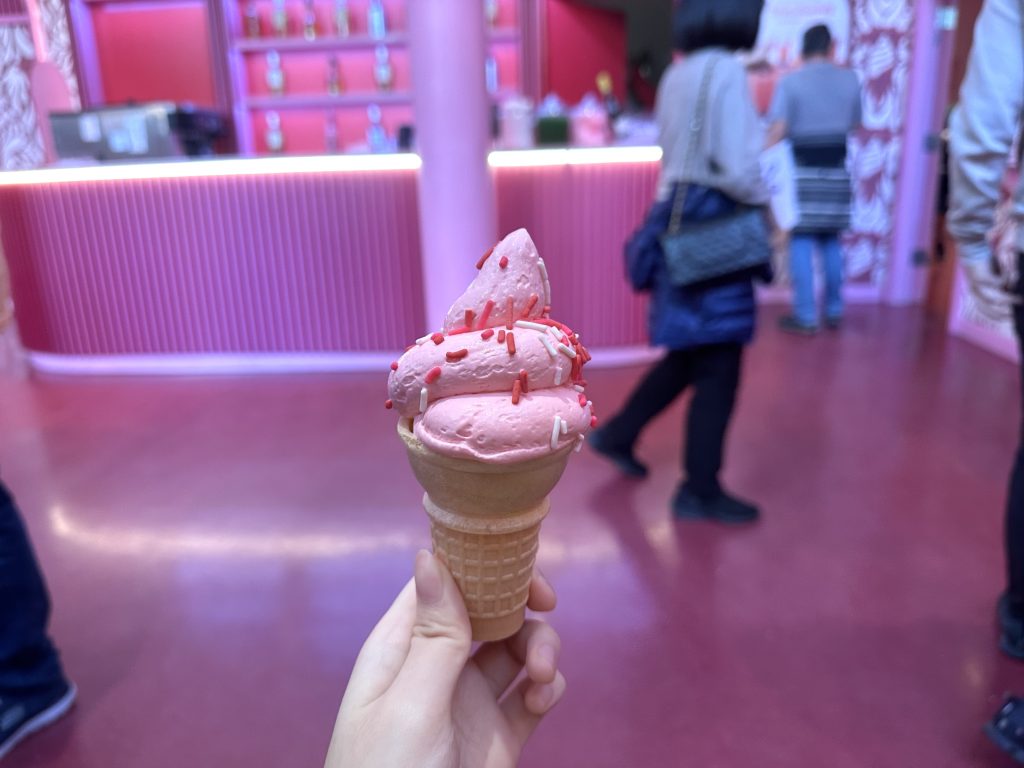 超巨大的粉色冰淇淋球裝飾!!搭配第二站的奶油冰淇淋一起享用